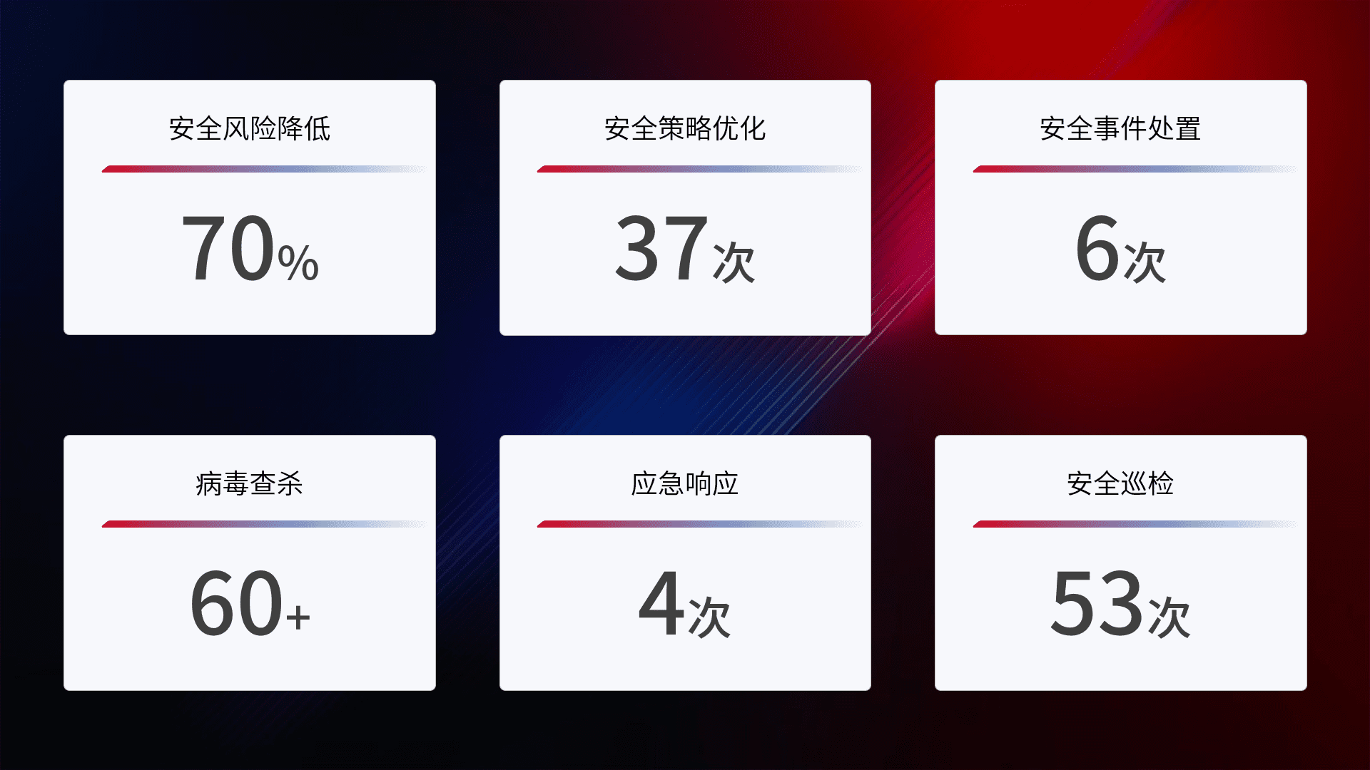 提供全面的安全事件报告体系,,,,包括处置报告、、、、周报、、、季度和年度总结,,,,结合持续监控,,,,帮助客户深入了解网络安全状况。。